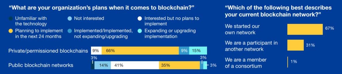This is a very good report commissioned by EY with the goal to assess the readiness of enterprise executives toward blockchain, and particularly, public blockchains. The results are perfectly aligned with what I see in the market as well. Yes, there is an interest in public-only blockchain solutions as everyone is tempted by the potential and the scale of such infrastructure. But on the other hand, we all agree that it won’t happen in the next few years despite the urge and enthusiasm of several companies. If someone is trying to convince you otherwise, they probably have a different agenda or are selling their own “bags”. The most developer-adopted public chain is Ethereum, which lacks any predictability with the launch of Ethereum 2.0 because it might or might not happen in 2021+. The most secure, trusted and decentralized blockchain protocol is the bitcoin network, but it lacks the developer adoption and tooling. My opinion is that we are going into the direction of public blockchain adoption for enterprises, but it will take a while and the transition will involve hybrid solutions first.